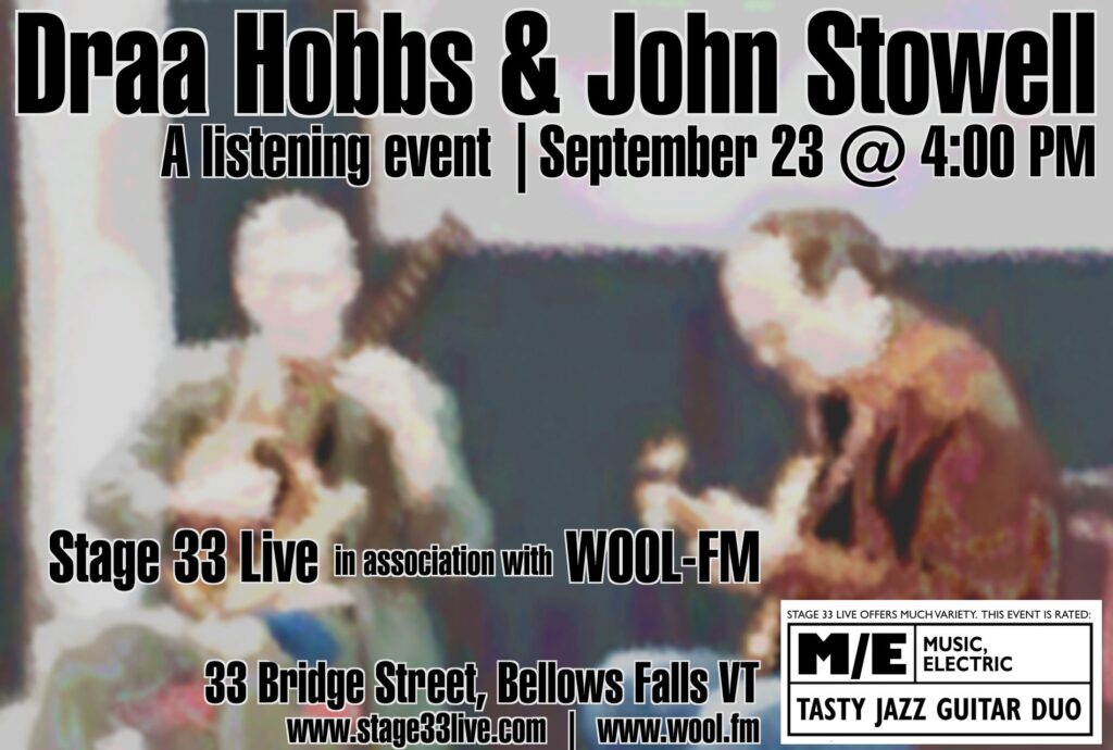 Hobbs and Stowell will perform as a duo playing jazz standards and classic compositions by Duke Ellington, Billy Strayhorn, Dave Brubeck, and others. The concert begins at 4:00 p.m. at 33 Bridge Street in Bellows Falls, and includes a cash bar and light snacks by Athens Pizza, and a raffle to benefit Stage 33 Live and Black Sheep Radio.